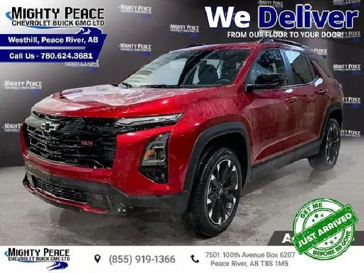 Wireless Charging, Power Liftgate, Heated Seats, Heated Steering Wheel, Remote Start, Adaptive Cruise Control, Blind Spot Detection, Lane Keep Assist, Apple CarPlay, Android Auto Your GM King of the North since 1969! We Deliver! From Our Floor to Your Door! Inside its thoughtfully designed cabin you’ll find premium materials, intuitive connectivity, and seating made for five. The 2026 Chevrolet Equinox brings together stylish design, smart technology, and everyday utility in a compact SUV that doesn’t compromise. Inside, you’ll enjoy a well-appointed interior equipped with modern infotainment, quality finishes, and comfortable seating for five. With its responsive driving characteristics, versatile cargo room, and a strong safety feature set, the Equinox stands out as a well-rounded choice for any driver. This Red SUV has an Automatic transmission and is powered by a 1.5L 4 Cylinder Engine. With that spritely motor it gets 9.7 L/100 km in the city and uses just 7.9 L/100 km out on the highway according to Transport Canada. Our Equinox's trim level is RS. Standard features include wireless charging for mobile devices, a power liftgate for rear cargo access, heated front seats, a heated steering wheel, wireless Apple CarPlay and Android Auto, remote engine start, and adaptive cruise control. Safety features also include lane keeping assist with lane departure warning, rear park assist, front pedestrian braking, and collision alert. To apply right now for financing use this link: https://www.mightypeacegm.ca/finance-application/ Incentives expire 2026-01-02. See dealer for details. Our AMVIC licensed business is conveniently located at 7501 100th Avenue in Peace River, AB, and we feature a wide array of models to choose from. At Mighty Peace Chevrolet Buick GMC Ltd., not only do we offer a wide selection of new vehicles to choose from, we also provide our customers with a GM Certified service and repair center. Book your test drive with one of our knowledgeable sales staff by calling (780) 624-3681. Vehicle pricing offer shown expires 2025-12-31. Come by and check out our fleet of 40 used cars and trucks and 100 new cars and trucks for sale in Peace River. o~o