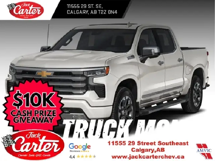 Looking for your best deal on a new Silverado in Calgary? Then try shopping with us: Jack Carters Chevrolet Buick GMC. Located in SE Calgary with easy access off the Deerfoot and Douglasdale, we’ve been giving Calgary and surrounding area the best deal and the best service since 1962. Our sales staff is experienced and friendly making your truck purchase easy and straightforward. No games, no gimmicks, no marked up GM MSRPs, just great advice and low prices from the start. Call us for a consult today 403-258-6300Choose your Model, flexibility of short box, standard box or long box. Choose your Cab fro Reg cab, Double cab and crew cab. Choose your engine from the 6.2L V8 that delivers best-in-class V8 power and towing, an available LZ0 Duramax® 3.0L Turbo-Diesel that offers better fuel efficiency than any other full-size pickup, the legendary 5.3L V8, and GM’s new Turbo 2.7L option producing the same torque as the 6.2L V8. Choose your trim from the everything you need Custom, the new tried and tested LT and the LTZ, sporty RST, the top of the line Highcountry, or go with our factory lifted lineup: the Custom Trailboss, LT Trail Boss, or the overcome anything Silverado ZR2. Choose Jack Carter and give our friendly sale staff a call at 403-258-6300 or visit us at jackcarterchev.com. Key Available features: 4X4 / Four Wheel Drive, G80 Locking Differential, Z71 Off Road Suspension, X31 off Road package, Front Bucket seats, Leather seats, Power passenger seat, memory seats, Max Trailer Package, NHT, Bose sound system, Power sliding rear window, Remote start, heated seats, heated steering wheel, cooled seats, Front park assist, rear parking assist, Surround vision camera, Wireless charging, Adaptive cruise control, Supercruise, Carbon Fiber Bed, Premium Suspension with adaptive ride control, XM radio, Apple Carplay and Android Auto, Massage seats, rear camera mirror and more.