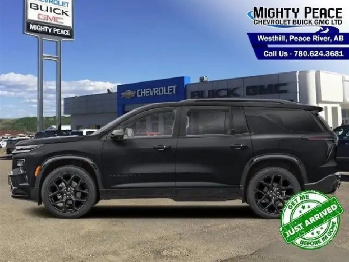 Super Cruise, Park Assist, Sunroof, Bose Premium Audio, Cooled Seats, Trailering Package, Wireless Charging, Heated Steering Wheel, Power Liftgate, 360 Camera, Remote Start, Adaptive Cruise Control, Blind Spot Monitoring Your GM King of the North since 1969! We Deliver! From Our Floor to Your Door! With versatile cargo configurations and refined ride quality it adapts easily from school runs to weekend adventures. The 2026 Chevrolet Traverse offers generous space, advanced connectivity and refined comfort for drivers who need a capable three-row SUV without compromise. Its interior delivers intuitive tech, premium finishes and seating designed to keep everyone comfortable on every journey. Built to support both daily routines and spirited getaways, the Traverse provides a confident, versatile ride for families and active lifestyles alike. This black SUV has an automatic transmission and is powered by a 328HP 2.5L 4 Cylinder Engine. Equipped with that brawny motor it gets 12.1 L/100 km in the city and 9.9 L/100 km out on the highway according to Transport Canada. Our Traverse's trim level is RS. This Traverse RS features GM Super Cruise for hands-free driving, automatic park assist, a panoramic sunroof and Bose premium audio, along with a trailering package, black aluminum wheels, ventilated and heated front seats with a heated steering wheel, leather upholstery, remote engine start, an AutoSense power liftgate for rear cargo access, a wireless charging pad, and an expansive 17.7-inch infotainment screen with inbuilt navigation, wireless Apple CarPlay and Android Auto, and SiriusXM. Safety features also include blind zone alert, automatic parking assist, HD surround vision, following distance indication and forward collision alert. To apply right now for financing use this link: https://www.mightypeacegm.ca/finance-application/ Incentives expire 2026-01-02. See dealer for details. Our AMVIC licensed business is conveniently located at 7501 100th Avenue in Peace River, AB, and we feature a wide array of models to choose from. At Mighty Peace Chevrolet Buick GMC Ltd., not only do we offer a wide selection of new vehicles to choose from, we also provide our customers with a GM Certified service and repair center. Book your test drive with one of our knowledgeable sales staff by calling (780) 624-3681. Vehicle pricing offer shown expires 2025-12-31. Come by and check out our fleet of 40 used cars and trucks and 110 new cars and trucks for sale in Peace River. o~o