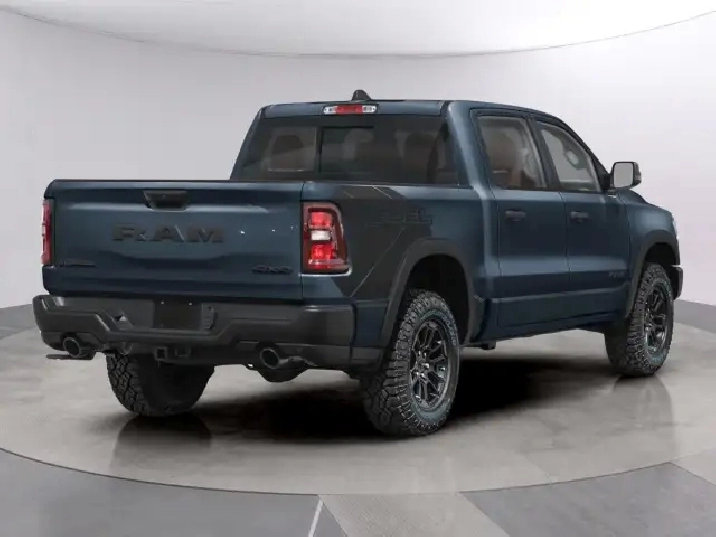 The 2026 Ram 1500 Rebel in stunning blue and equipped with 4x4 capabilities is the epitome of power and confidence on any terrain. This new Rebel 4x4 Crew Cab with a 57 box demonstrates exceptional handling for both urban and off-road adventures.