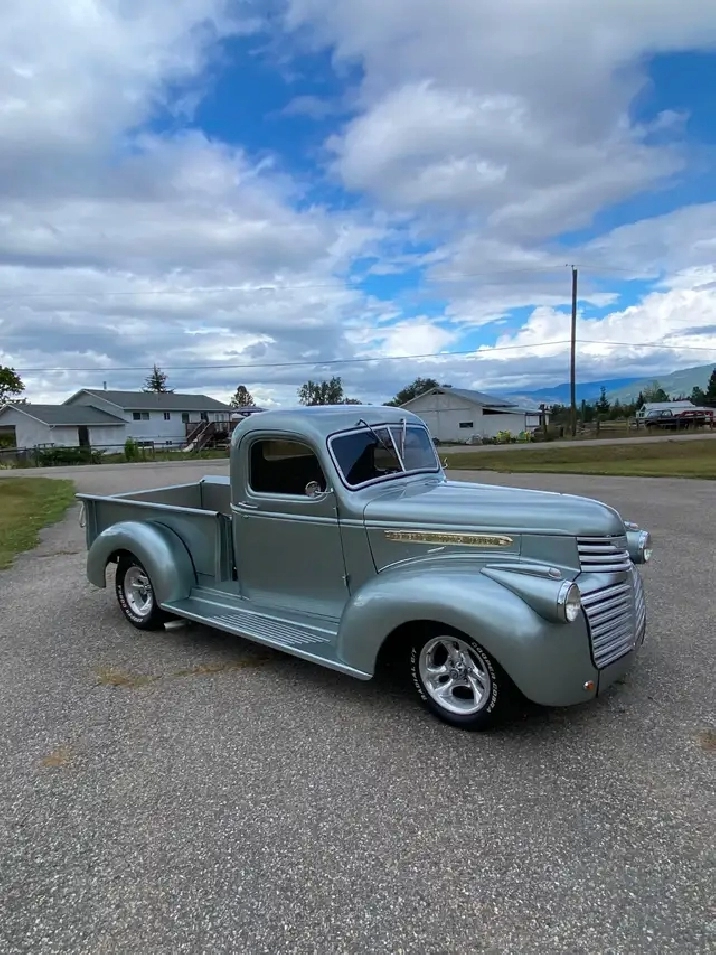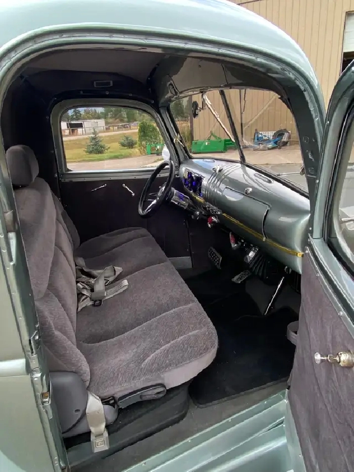Frame off custom restoration on this beautiful and tastefully modified resto-mod ’46 GMC truck. Fiberglass front and rear fenders with remaining restored / new metal / steel areas which include, cab, hood, running boards and box. Metallic silver paint has a slight green tint to it. Oak wood in box. Custom rear LED tail lights. Paint matched front grill. Headlights with chrome surrounds. Custom LED turn signal lights.