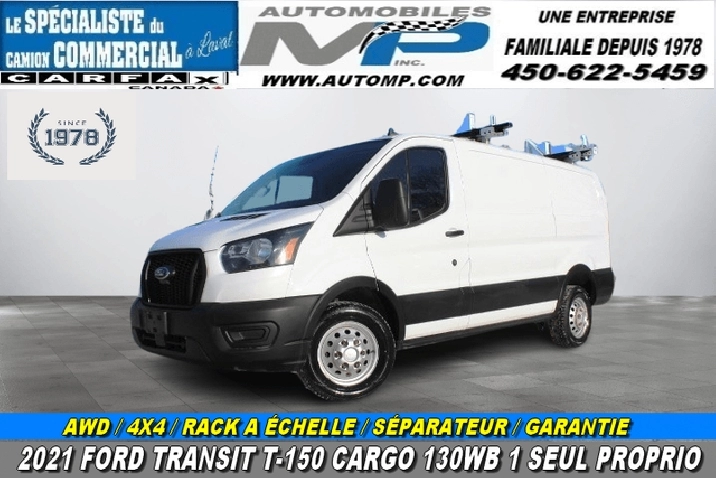 2021 FORD TRANSIT T-150 CARGO 130WB AWD / 4X4 / 1 SEUL PROPRIO / 1 SEUL PROPRIO / RACK A ECHELLE ET SÉPARATEUR INTÉRIEUR / CAMION IMPECCABLE ET GARANTIE / FAUT VOIR, À QUI LA CHANCE / TÉLÉPHONE OU TEXTO CARL (514-968-7229).
